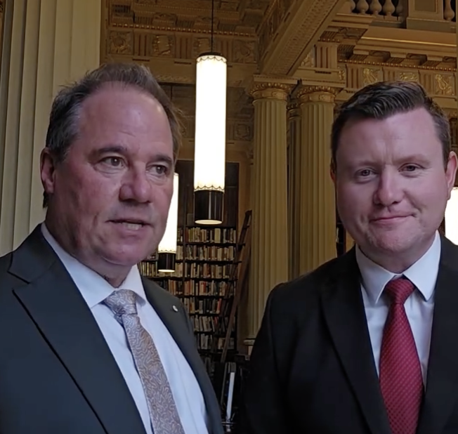 Paul Mercurio MP (left) and Tim Richardson MP record an International Men's Day message on Facebook.